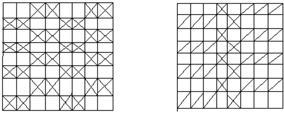 This is plain weaves in which two or more ends weaves together as one. To form weft rib the thick picks always pass over or under two or more thick or fine ends. Here the plain weave is extended for two ends as illustrated for 2-2 filling rib & a 3-1-1-3 filling rib below;